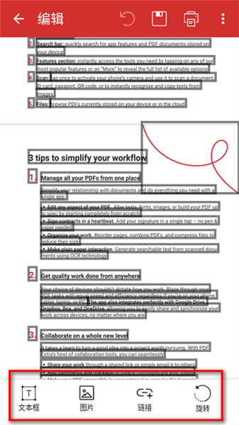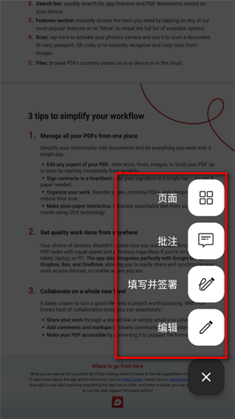 3、开启后您可以在打开的文档上进行批注、填写并签署以及编辑等操作;