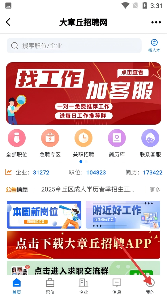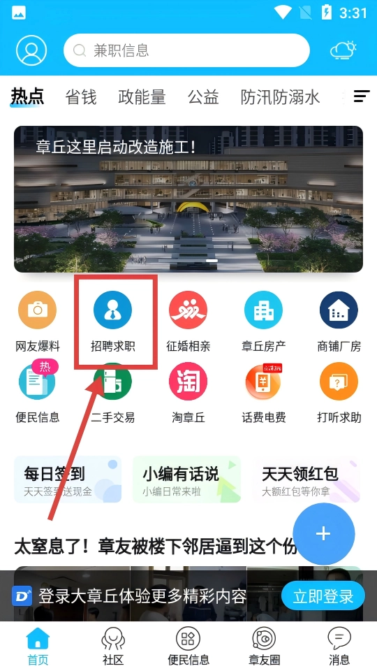 1. 在首页点击【招聘求职】,即可进入大章丘招聘网,进而开启招聘或求职的流程。