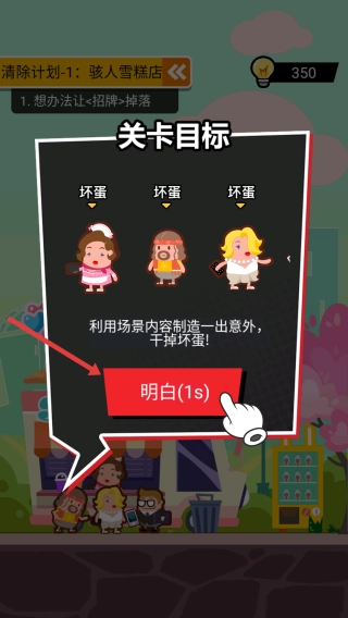 1. 明确目标:点击“明白”,关闭关卡目标提示,确认执行制造意外的任务。