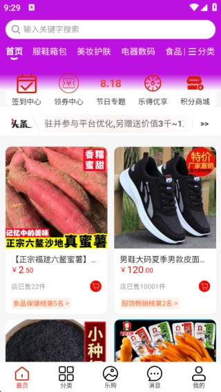 1、首页设有签到中心、领券中心、节日专题、乐得优享、积分商城等板块,还能知晓各类推荐商品。