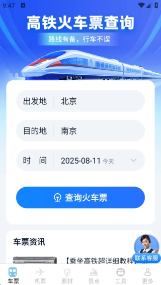 实时查火车机票是一款能随时快速查询火车票与机票的软件。通过它,你不仅能获取不同的查询服务,了解乘车相关信息,还能知晓诗词相关的天气情况,掌握各类景点信息,甚至对各地美食的了解也极为全面。
