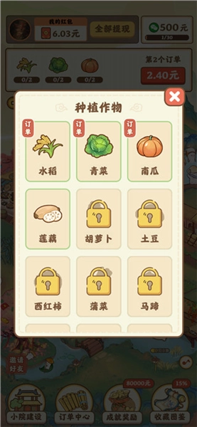 3、当然只靠种植就太慢了,可以选择去完成一些订单,这样会大大提升你的红包数量,满足一定数量后就可以提现了。