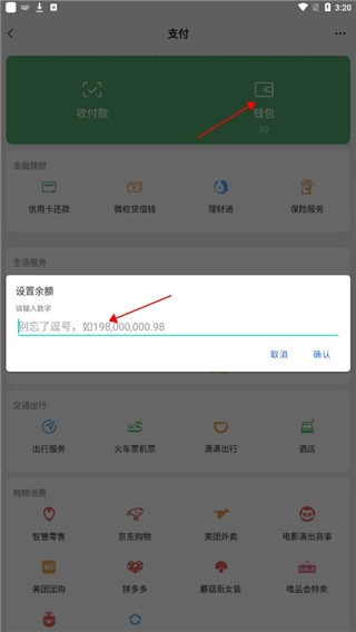 3、点击钱包,设置余额,记得要填逗号;