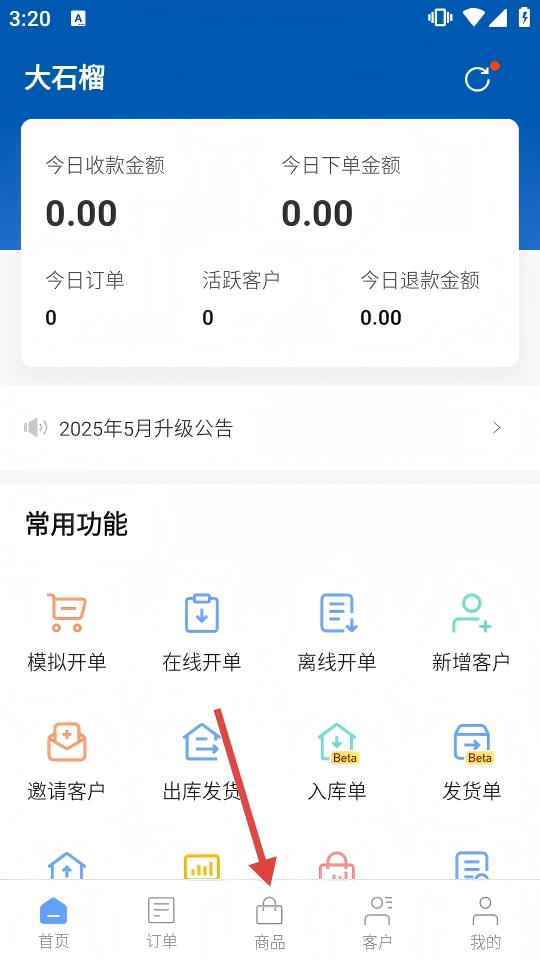 2、进入【大石榴】首页,点击底部【商品】图标,切换到商品管理模块。