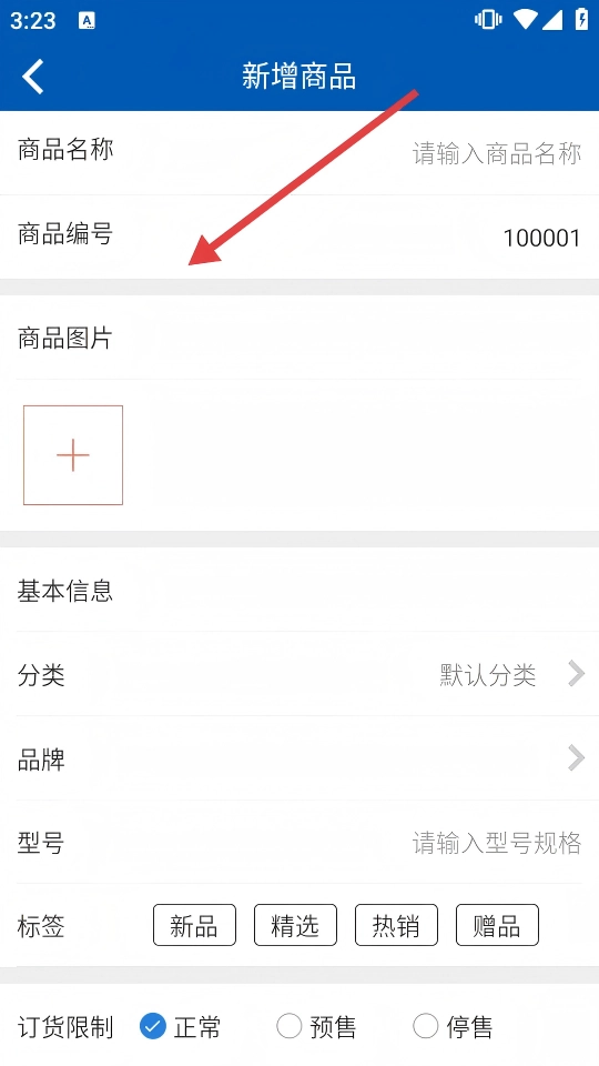 4、在【新增商品】页,填写【商品名称】【商品编号】等信息,完善商品资料待提交。