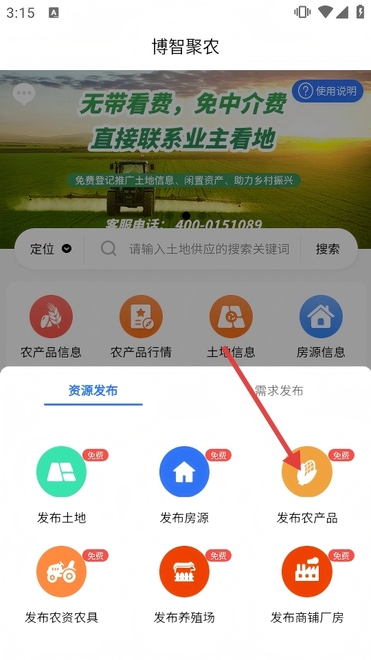 3、在【发布】菜单的【资源发布】区,选【发布农产品】,进入信息填写页。