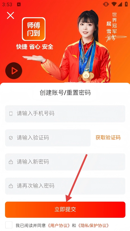 4、填写手机号、验证码、密码,勾选协议后点【立即提交】,完成账号注册。