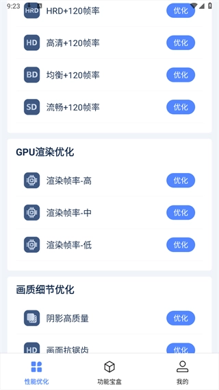 2、用户可以在性能优化界面进行画质模式、帧数、GPU渲染帧数、画质细节优化、音质优化的修改