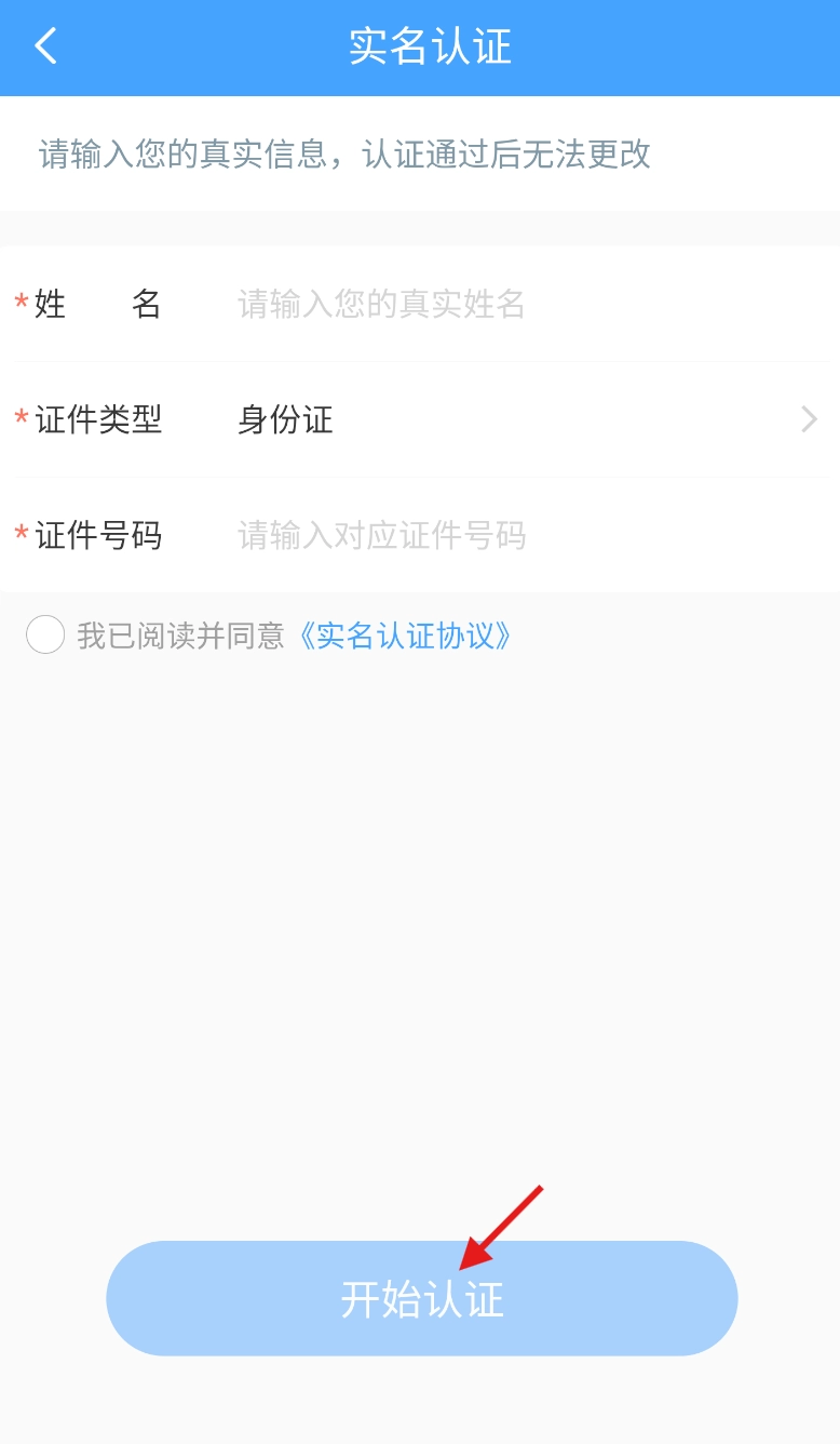 3、跳转至实名认证页面后,完整填写个人身份信息,确认无误后点击 “开始认证” 完成操作。