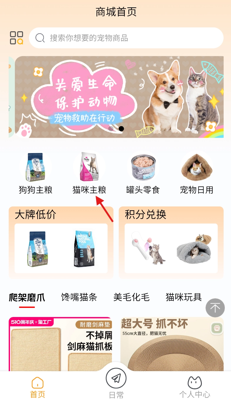 1. 打开养宠记,进入首页,接着点击首页里的“猫粮主食”类目,即可进入。