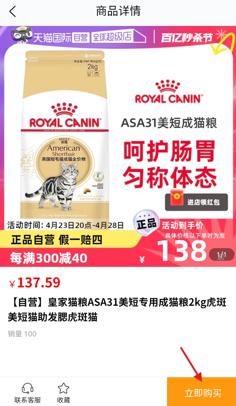 2、跳转至宠物商品页面,浏览各类猫粮商品,选中感兴趣的款式点击进入详情页查看。