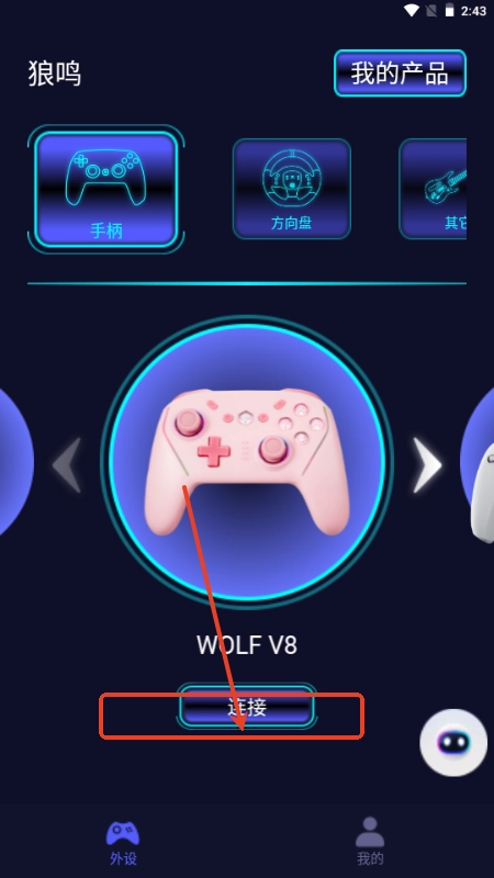 2、在手机上启动狼鸣手柄App,系统会自动搜索附近的手柄设备,用户只需选择合适的手柄类型,点击连接按钮即可。