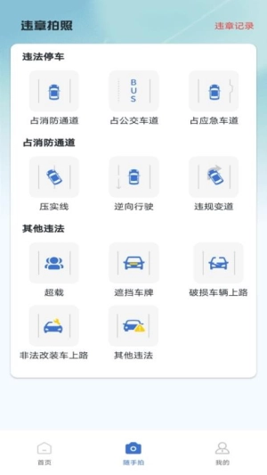 1、开启123违章随手拍,于首页挑选“违章拍照”功能,进而进入拍照取证页面。