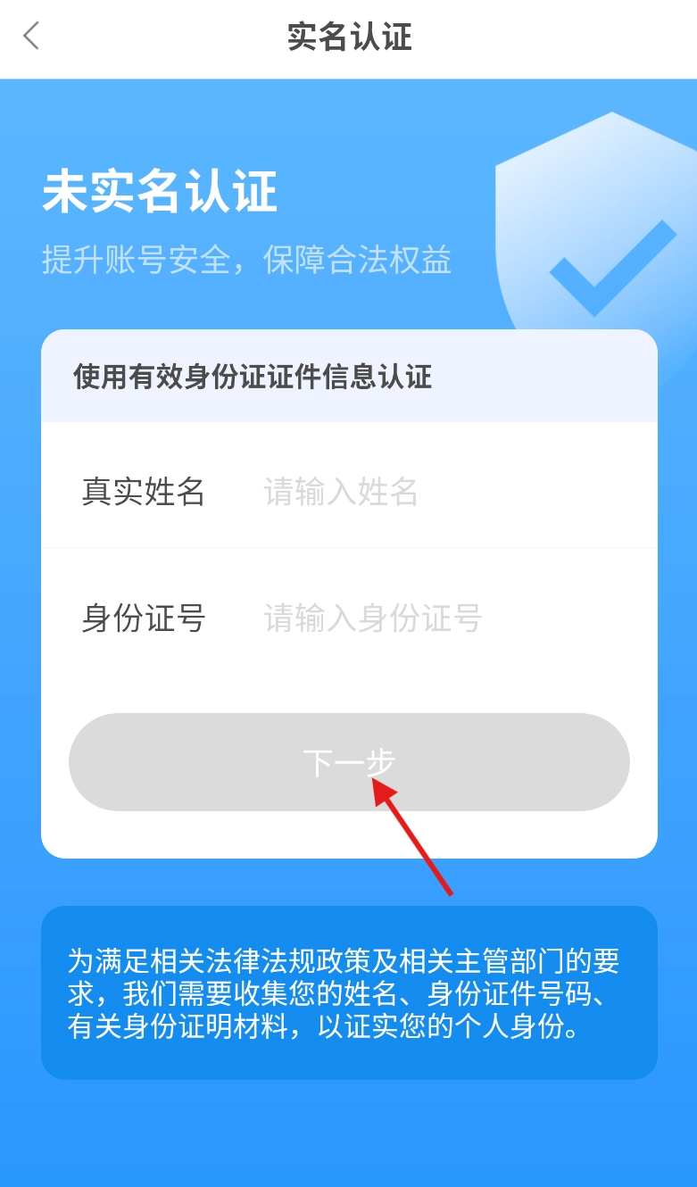 3、在认证页面,准确填写个人身份证号、姓名等信息,仔细核对无误后点击下一步完成认证。