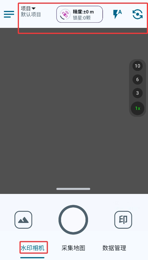 1. 启动之后进入拍摄界面,底部功能栏设有水印设置、数据管理以及地图定位等实用工具。
