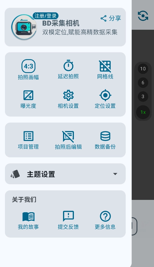2、点击左上角设置图标,可调整拍摄参数(画幅比例、延时拍摄)和定位服务等核心功能。