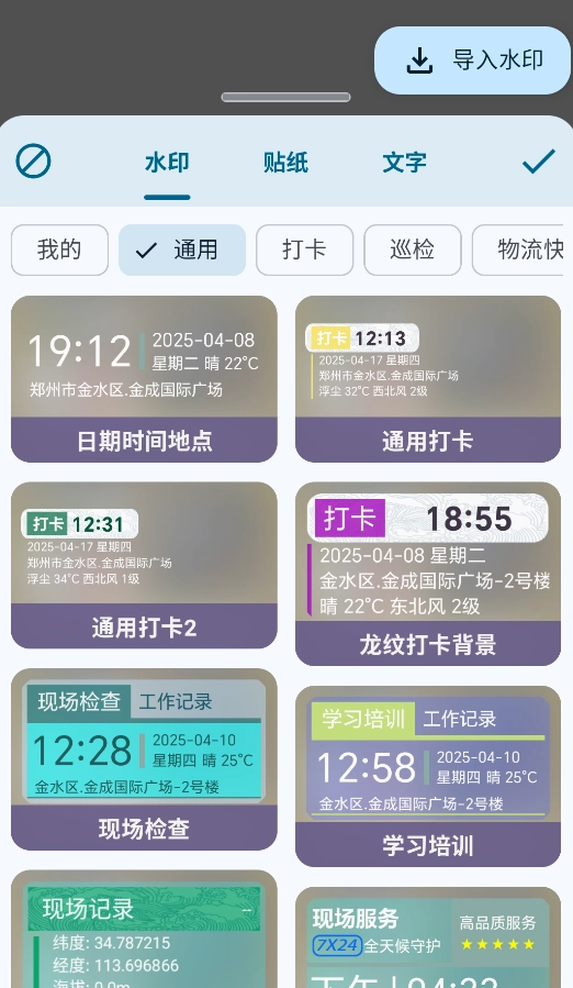 1、专业水印模板库:拥有超200种行业专属水印模板,广泛覆盖工程、测绘、巡检等专业领域,全方位满足各类工作场景的需求。