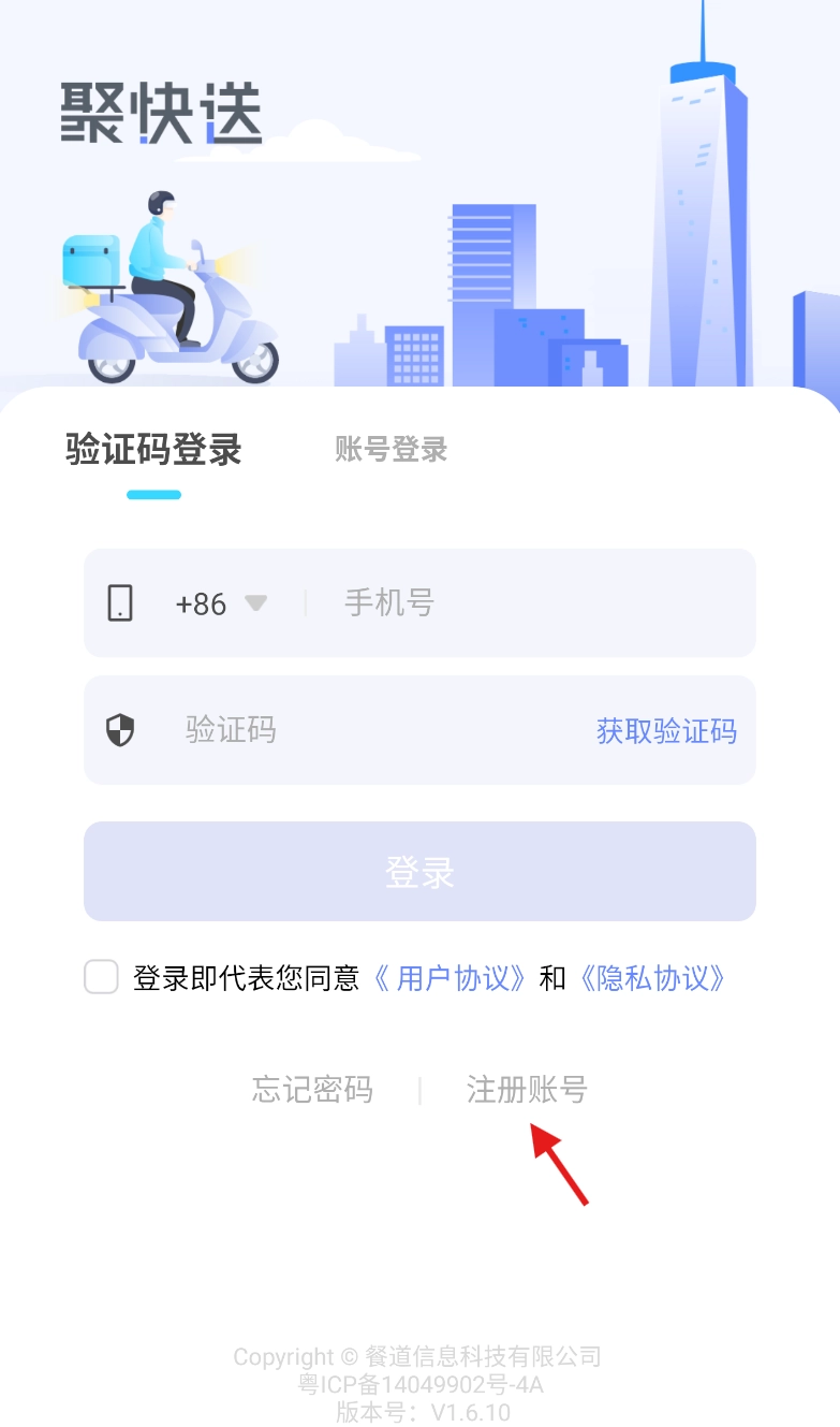 1. 首先在手机里找到聚快送的应用图标,轻轻点击将其打开。进入应用界面后,再点击界面中的注册账号选项。