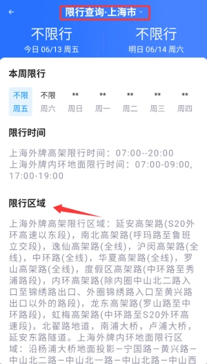 3、系统将显示该城市最新的限行规定、尾号轮换规则及限行区域地图标注。