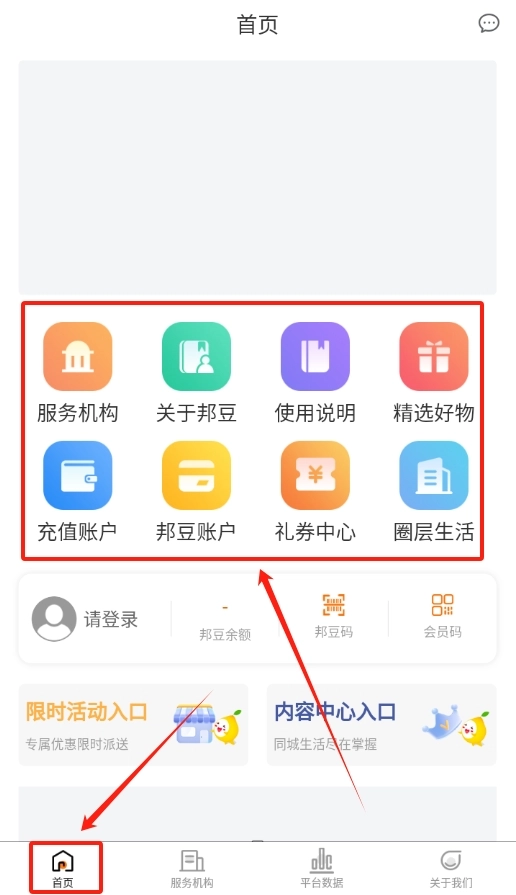 1、成功开启邦豆生活后,我们轻轻点击打开。一进入首页,就能看到醒目的“请登录”字样,毫不犹豫地点击它。