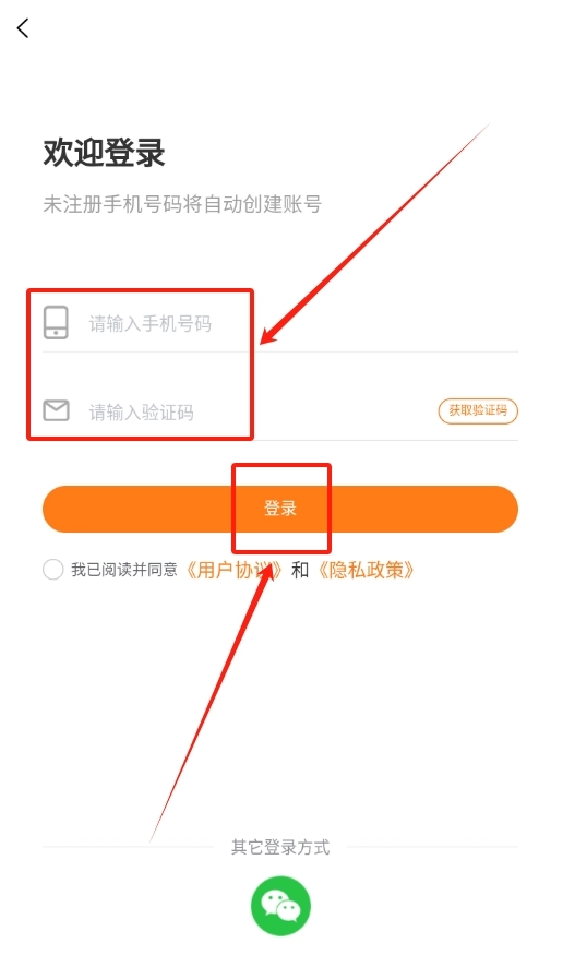 2、 跳转至登录页面后,在指定位置依次填入自己的手机号,接着获取并输入收到的验证码,完成登录操作 。