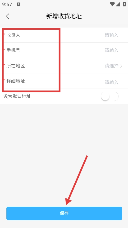 4、在【新增收货地址】页面,填写【收货人】【手机号】【所在地区】【详细地址】信息,点击【保存】完成设置。