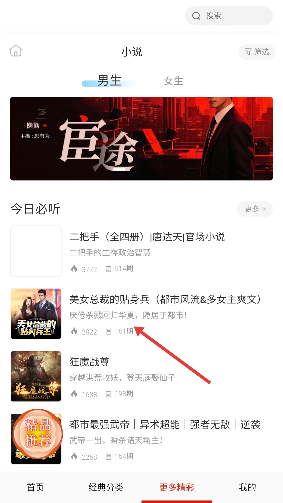 3、选择【想听的小说】,进入作品详情开启听书体验。