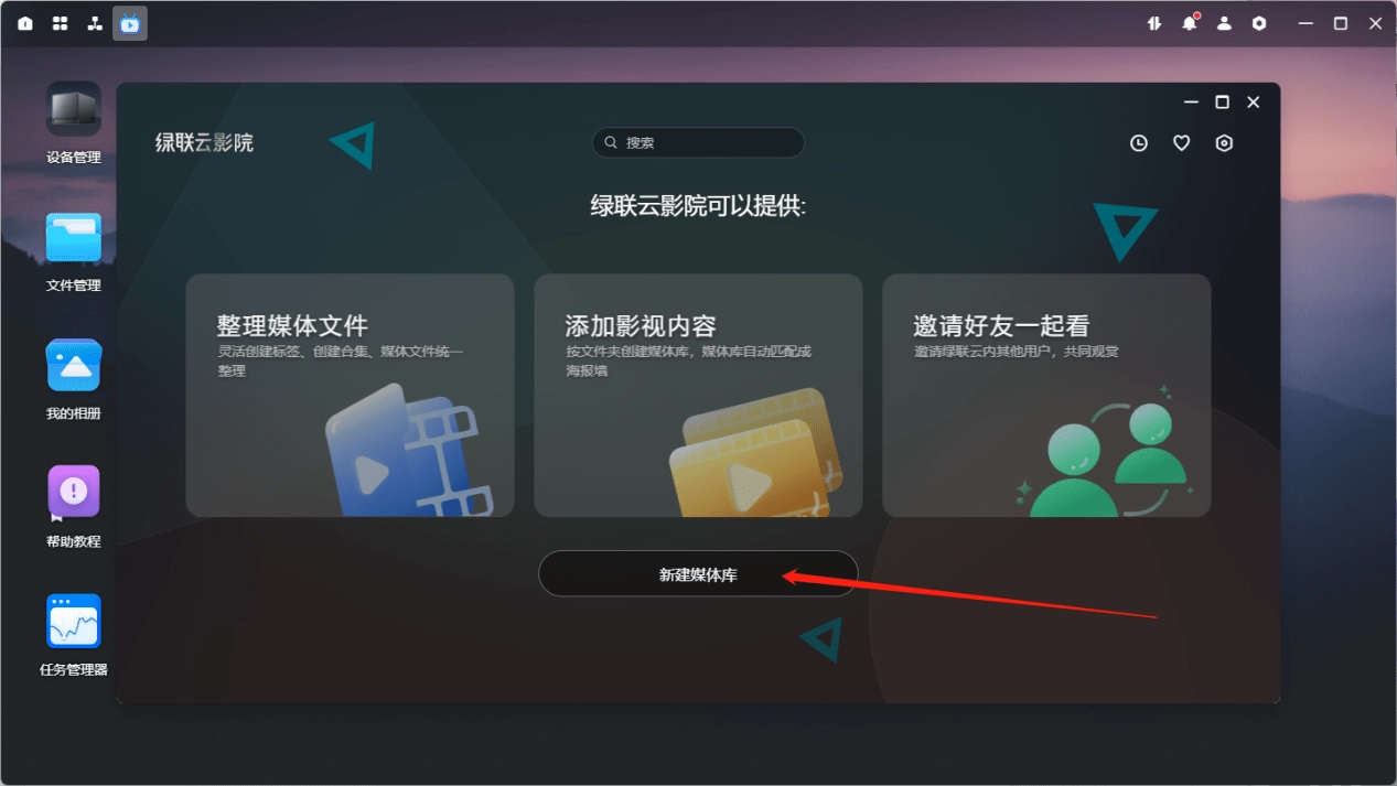进入绿联云影院后,点击新建媒体库。
