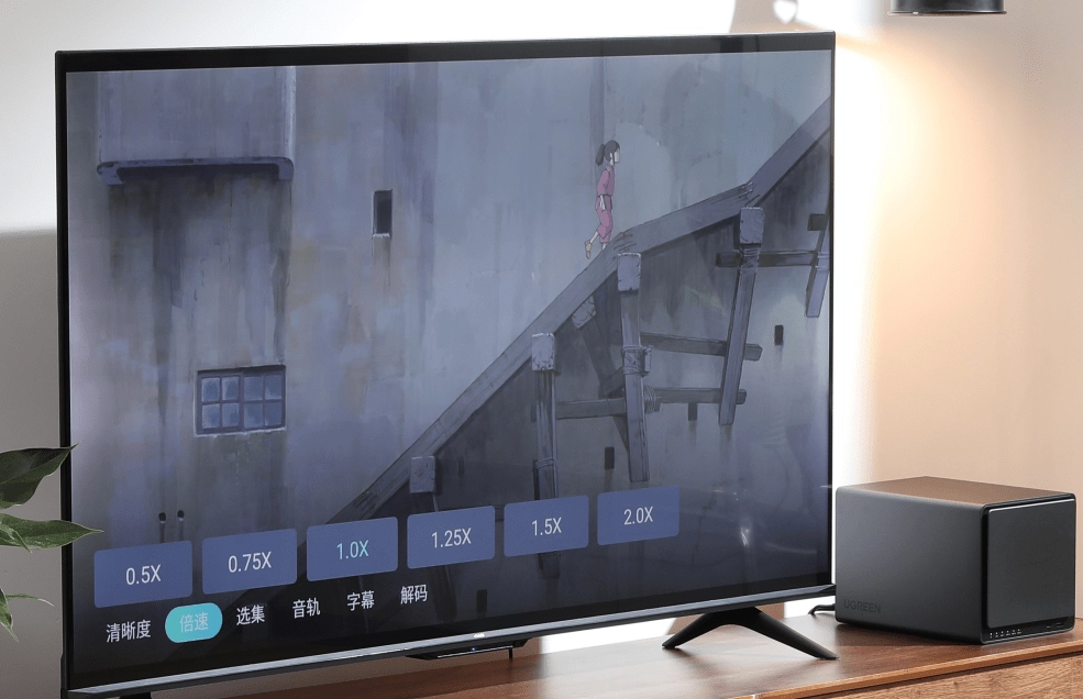 绿联云tv版可以调节清晰度,支持倍速播放,遥控器可以直接选集,选择音轨、字幕和解码方式。