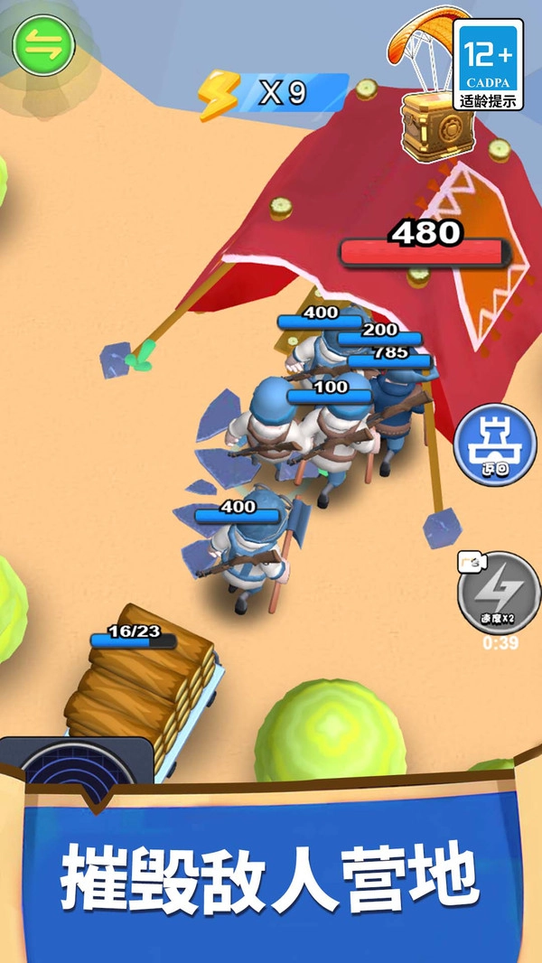 踏入危机四伏的荒岛,加入暴走军团,打造属于你的最强军团!在暴走军团中,带领士兵们砍伐并收集木材资源,组建一支强大的军队,战胜每一个敌方士兵,持续扩充军团队伍!不仅如此,在暴走军团里,玩家还能占领敌方大本营,对士兵和板车进行合成升级,全方位提升军团实力,投身小岛争霸的行列!