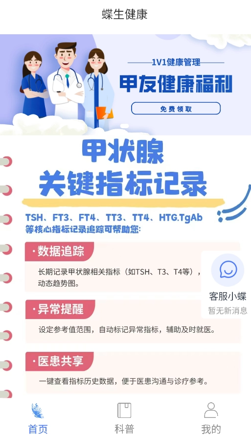 蝶生健康真的很实用,专注于甲状腺相关知识的科普。每篇科普文章都配有图片讲解,通俗易懂。要是你有任何疑问,还能直接咨询客服,他们回复速度很快。如果你关注甲状腺健康,强烈推荐你下载一个试试,内容专业靠谱,用起来让人安心,一试便知其好用程度。