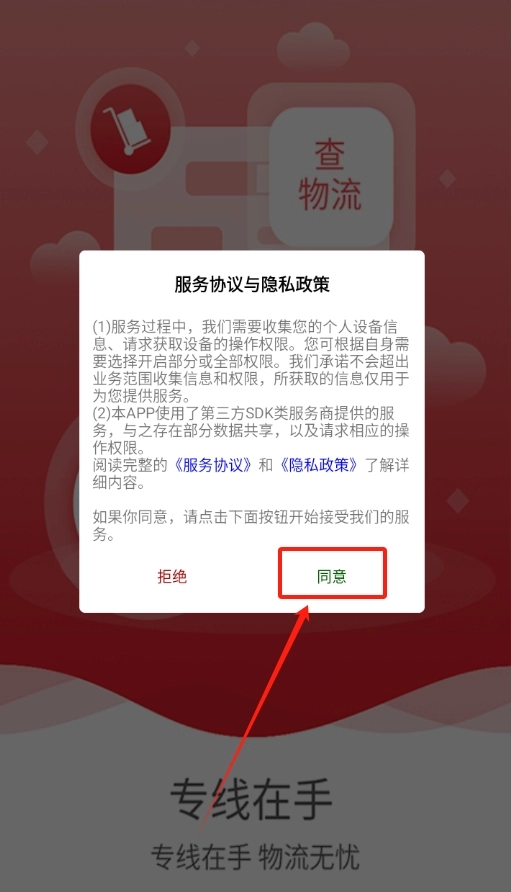 2、进入软件首页,仔细阅读用户协议后,点击屏幕上的 “同意” 按钮。