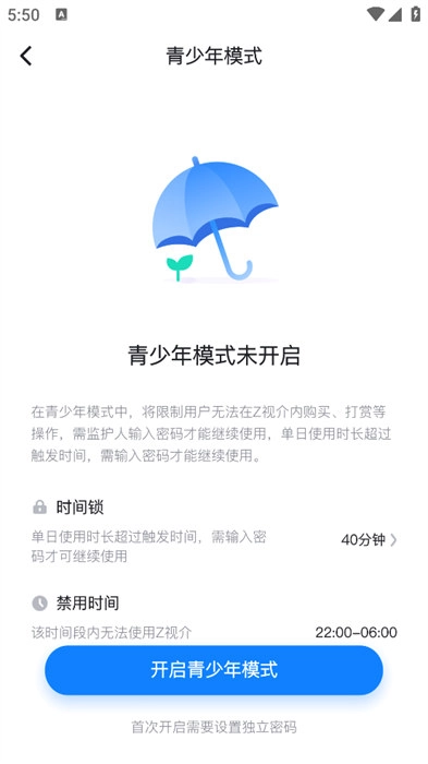 1、进入软件后,可选择开启青少年模式。开启该模式后,会存在一定的使用时间限制。