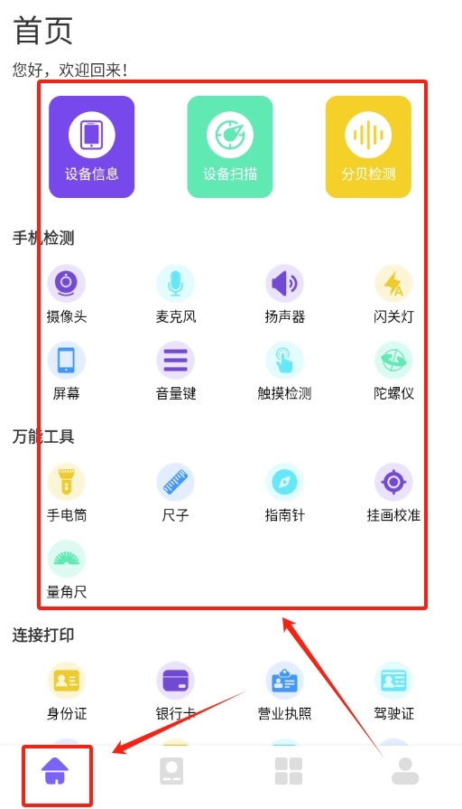 1. 打开软件,首页便会呈现诸多实用功能,诸如分贝仪、屏幕测试等皆可直接使用。