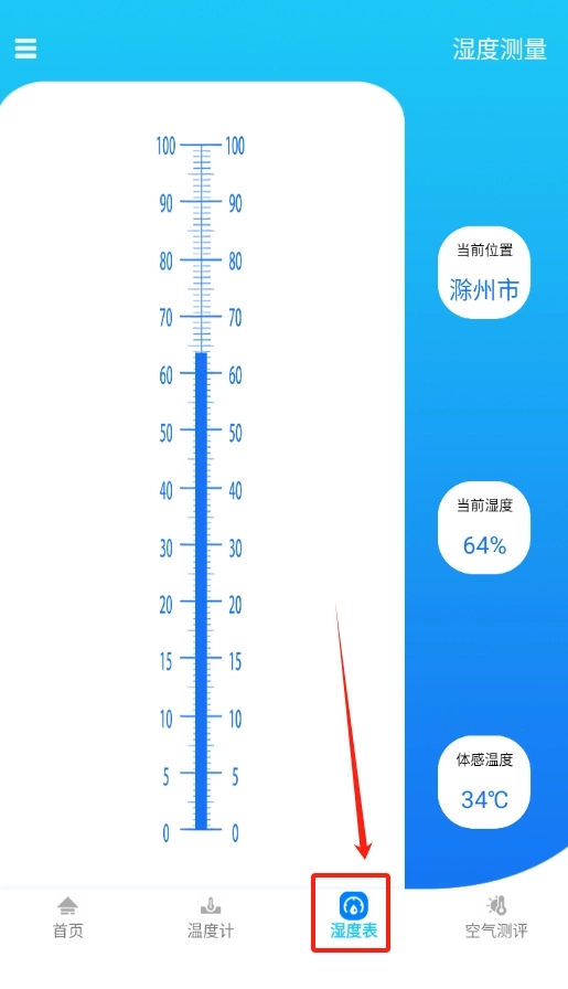 3、如果您想了解湿度情况,滑动页面,找到湿度表样式的图标,点进去就能看到湿度数值啦。