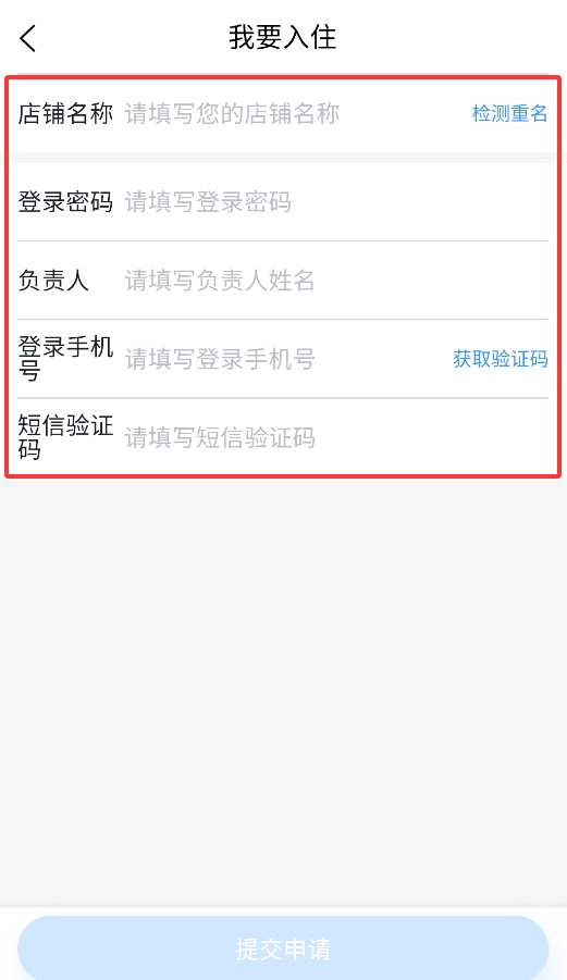 2、填写店铺基本信息(名称、负责人等),通过手机验证码完成身份核验,并设置登录密码。