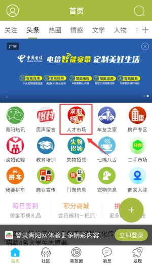 1. 开启青阳网后,于首页导航栏挑选“人才市场”频道,此频道汇聚了各类企业的最新招聘信息。