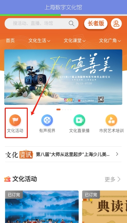 1. 开启上海数字文化馆软件,进入首页后,“文化活动”选项清晰可见,直接点击进入。