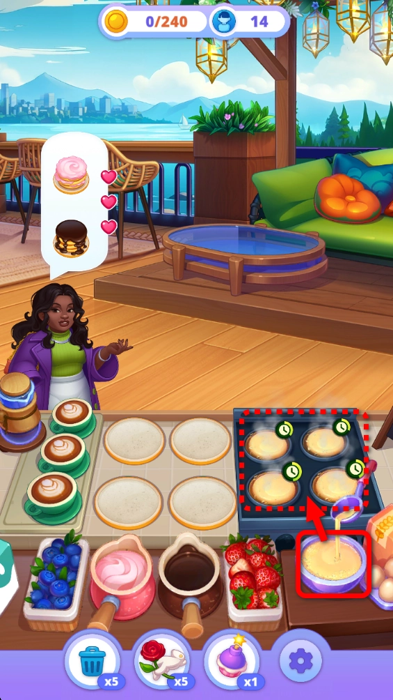 1.游戏开始后,点击右下角的面糊倒进煎饼盘里面。