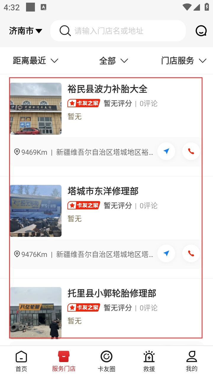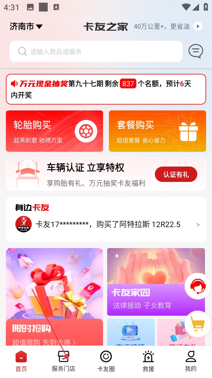 1. 开启【卡友之家】,于首页点击底部的【服务门店】,从而进入门店查找页面。