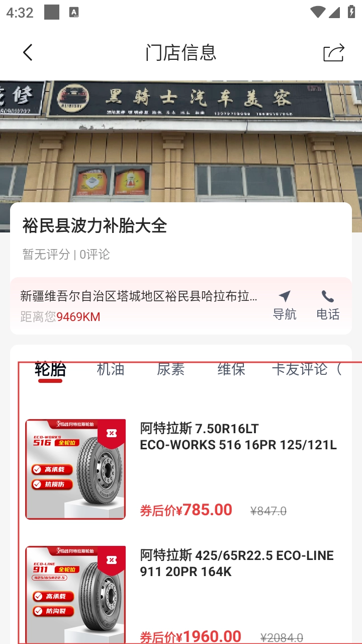 3、进入门店信息页,查看轮胎等商品列表,点击想购买的轮胎商品。