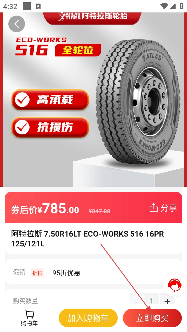 4、在轮胎详情页,确认规格、价格等,点击【立即购买】完成交易流程。