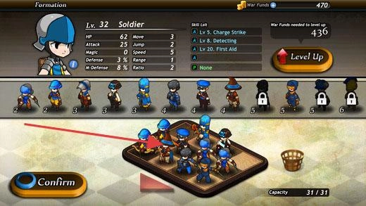 3、编队界面,可编排士兵(如Lv.32Soldier),查看属性、技能,点击“Confirm”确认编队,进行战斗准备。