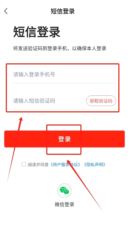 3、来到登录界面,在对应位置输入你的手机号,接着将收到的验证码填入,点击登录即可。