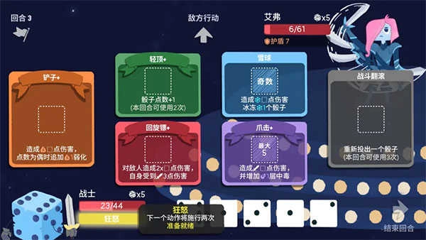 1.骰子出现的点数是不确定的,根据个人装备的攻击技能搭配点数进行战斗,让战斗更加具有不确定性。