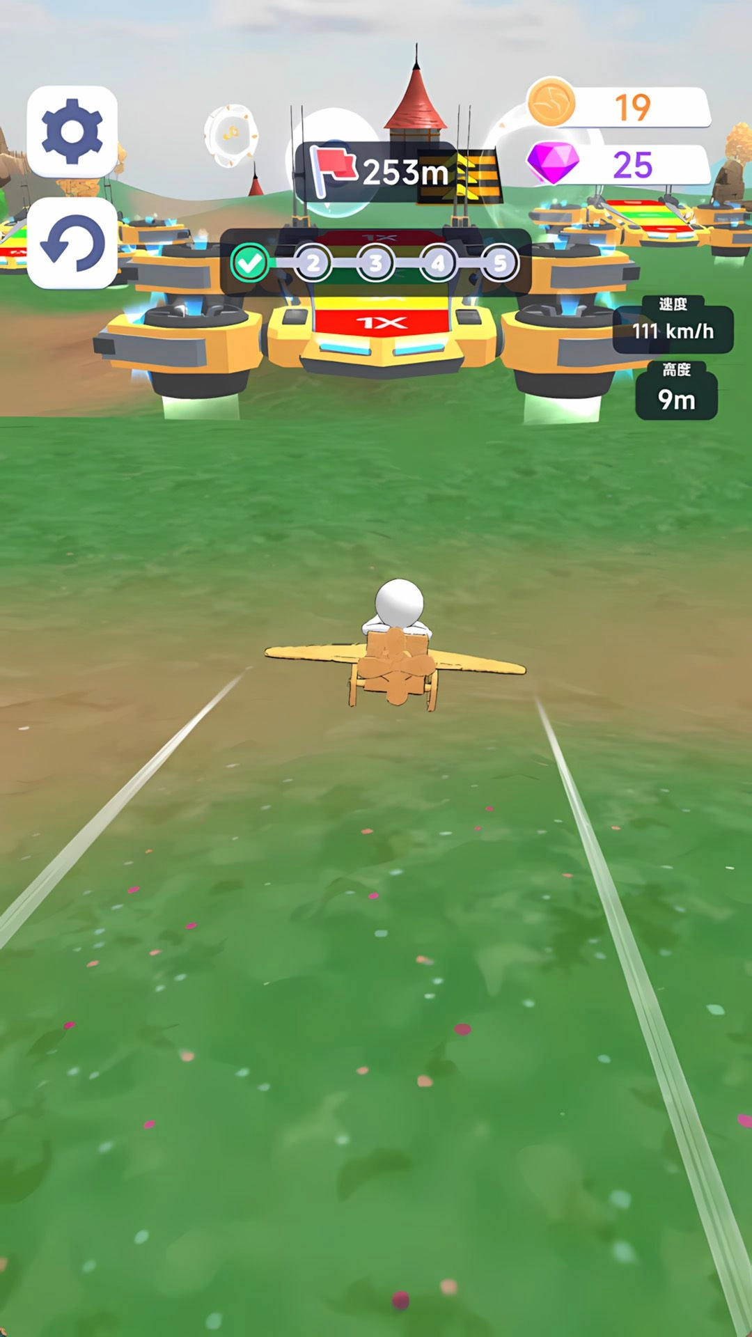 2、飞行中通过滑动屏幕调整飞行角度,躲避障碍物并收集加速道具。