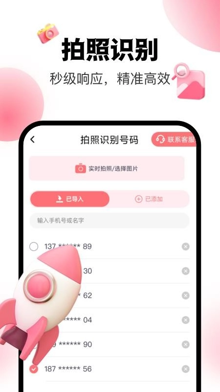 这里也可以让你拍照识别相关的号码,输入号码胡可快捷识别,轻松拍照识别相关的手机号码。