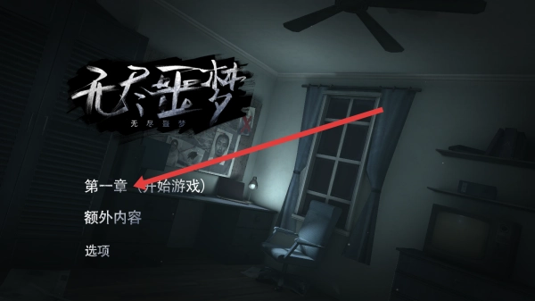1. 在主界面,选择【第一章(开始游戏)】,随即进入恐怖解谜场景,并开启“前往二楼主卧”的任务。