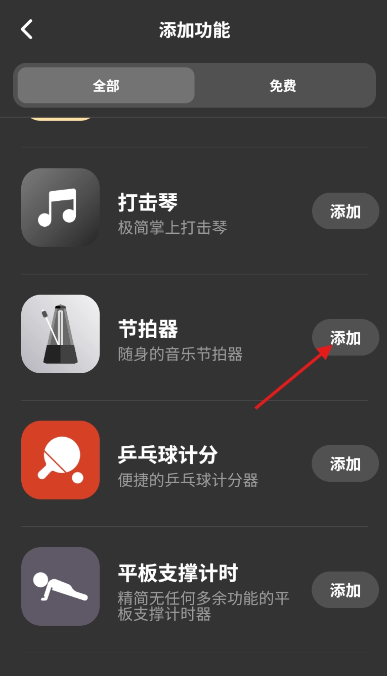 2、进入功能页面后,向下滑动浏览众多工具,找到节拍器工具并点击添加按钮。