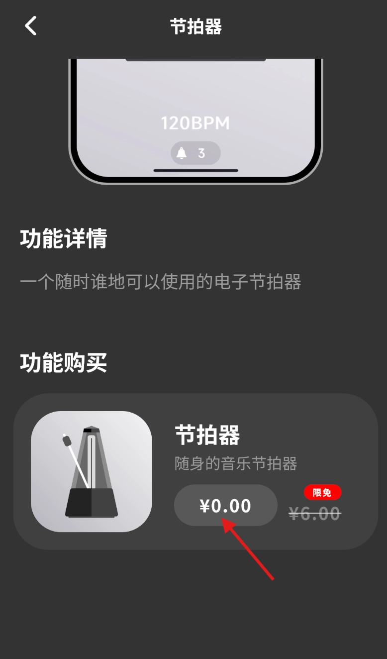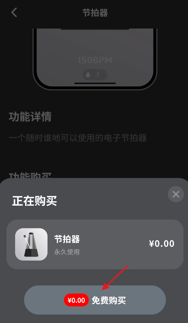 4、在支付界面中,选择 “免费购买” 选项,确认操作后即可完成节拍器添加。